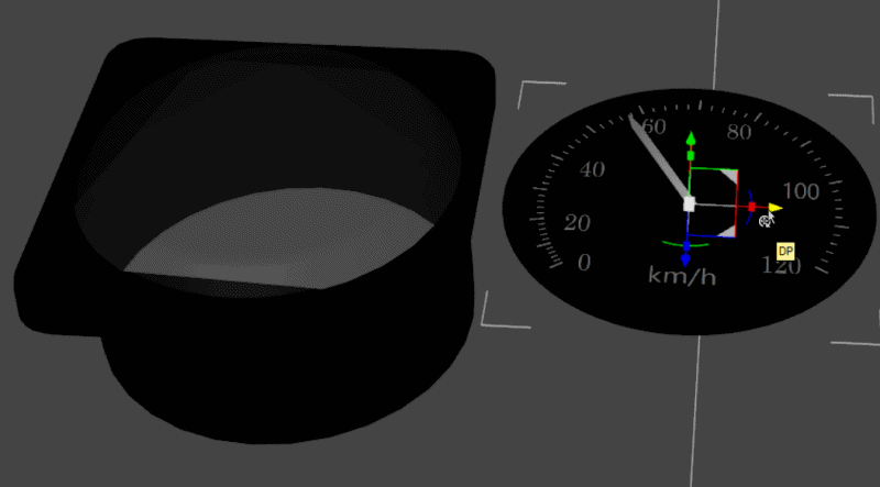 (4) 文字盤メッシュと指針メッシュのマテリアルなどを設定し、文字盤と指針を収める計器の容器となるメッシュをインポート、それに文字盤を挿入して計器を作成します。