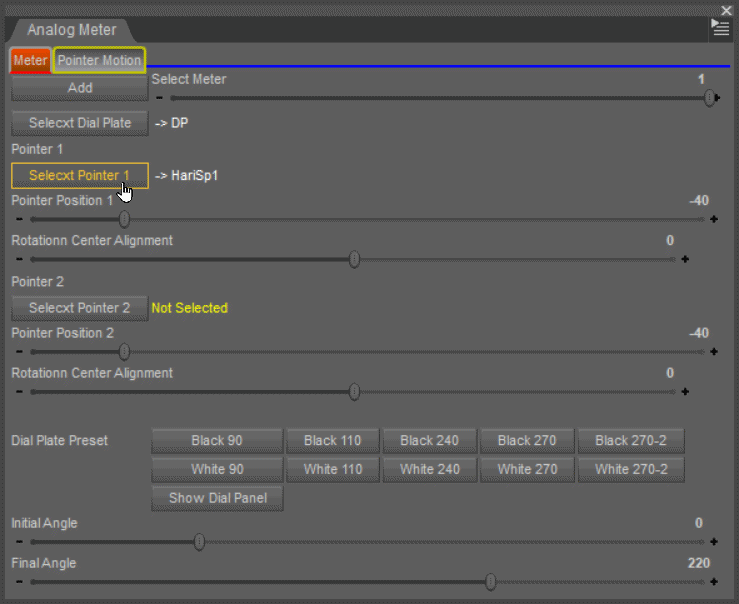 タイムラインを使った指針の動き制御指針の動きはシーンの時間を使って制御できます。制御を有効にするにはまず文字盤と指針の設定後、下図にあるプリセットボタンやスライダーを使って指針の可動範囲を指定しなければなりません。 なお、Windowsが日本語モードの場合、プラグイン本体のメニューは日本語表示になります。