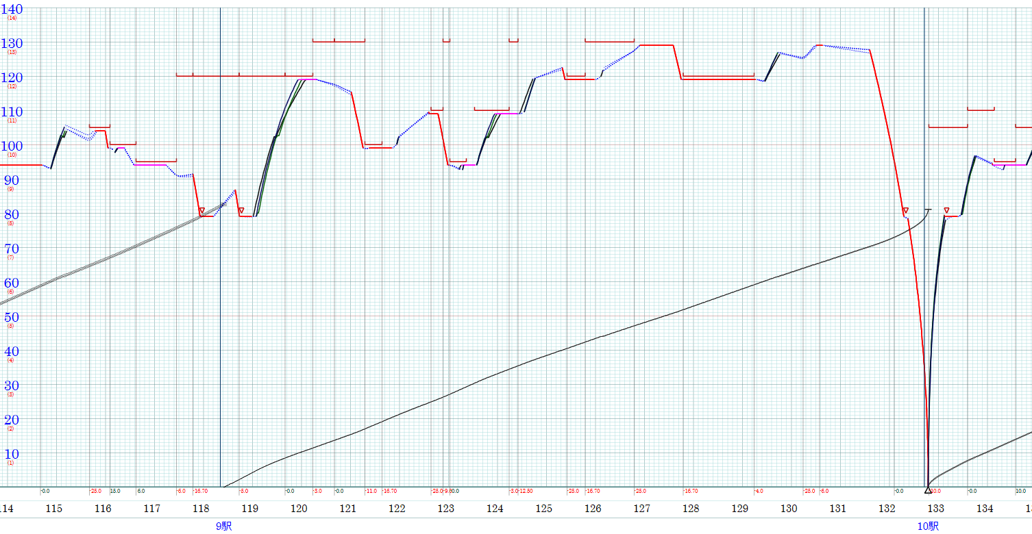 まずはノンストップで走らせてみましょう。 運転曲線が次の図です。黒の実線がフルノッチ力行、ピンクの実践が低ノッチ力行、青の点線が惰行、赤の実線が制動を表しています。 上り勾配惰行では制限を考慮してかなり効率的な運転設定になっているようで、無駄な制動が入りにくいエコモードでの運転のようです。 ノッチマンミニの運転設定にはスポーツモードのような速度重視の設定がありますが今回は使っていません。